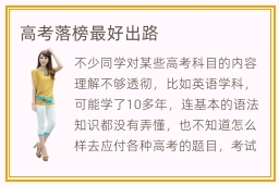 不少同学对某些高考科目的内容理解不够透彻,比如英语学科,可能学了10多年,连基本的语法知识都没有弄懂,也不知道怎么样去应付各种高考的题目,考试总分很糟糕,会被拖后腿。高考落榜最好出路并不确定,主要看大家的安排以及未来的规划。有些同学觉得自己在高考后成绩很不理想,跟平时的差距太大,会考虑重新读一年高三。另外,也有同学觉得已经是正常发挥,即便高考不理想,也难以在下一年取得好成绩,会考虑技工学院以及高职院校。技工学校的水平很高,不少专科生都能在技术学校的帮助下,努力提升专业的实力。高职院校的学风好吗,高职院校的学风当然相对不错,因为学校也很严格,采用相当多样的管理形式,促使大家在融洽的氛围中,积累更多专业知识。