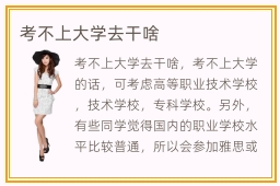 考不上大学去干啥,考不上大学的话,可考虑高等职业技术学校,技术学校,专科学校。另外,有些同学觉得国内的职业学校水平比较普通,所以会参加雅思或托福,得到比较好的成绩后,就可以报名一些国外重点大学。高等职业学院是什么文凭,这些虽然是三本院校,属于专科的学历,但同学可以在学校帮助下,积累更多经验,提高专业成绩,达到较好的标准,应聘各种高水平的工作。三本院校的学历有没有用,三本院校的学历很有用,因为国内很多工作都需要高学历,至少是本科或专科学历。而且在未来发展道路上,学历的重要性不言而喻,同学要珍惜上学的机会。另外大家报名三本院校后不要气馁,因为很多人在经过不断努力后,强化个人工作表现,从而比高学历学生获得更多优势。