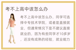 考不上高中该怎么办,同学可选择中专技术学院,或者是直接就业,但通常情况下是不建议直接就业的,因为有些同学才10多岁,还没有成熟的经验,就业能力不够强,技术优势不明显,容易被社会淘汰。中专院校是什么文凭,中专院校属于普通的文凭,很多工作都是要大专和本科方面的学历,中专的学生可能很难找到这方面的工作。但如果同学感觉工作压力很大,可以进一步提升个人的专业素质,改善工作能力。专科学校竞争力大不大,专科学院的竞争力也不错,许多同学报名这些学校之后,可以掌握就业方面的技术,进入社会后找到好工作。当然专科院校的学生也要注意,有很多工作都要求本科以上的学历,找工作时可能会出于被动的状态,大家也要谨慎面对这样的状况。