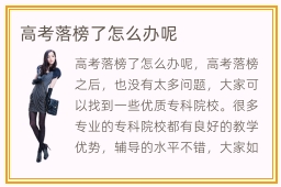 高考落榜了怎么办呢,高考落榜之后,也没有太多问题,大家可以找到一些优质专科院校。很多专业的专科院校都有良好的教学优势,辅导的水平不错,大家如果有兴趣,还可以重新再复习一遍,重新准备高考,给自己一次重新来过的机会。专科院校的教学优势相当突出,可以针对就业方面的要求安排课程,同学可以尽量多理解应用类的知识,与企业实际需求充分融合,提升个人的技术水平,集中精力攻破某些职业技术难关。专职类院校好不好,专职院校的针对性很强,主要是结合多种实用性的教学课程,帮助学生掌握实践中的技术问题,培养出许多技能突出的人才。另外,职业教育学校可以打破条条框框,帮助学生挖掘兴趣,激发同学的学习动力,减少学习过程的无聊感。