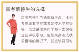 高考落榜生的选择有很多,比如考虑职业学院或者是技术学院等等。虽然说很多同学都不太想在这些学校学习。但如果高考成绩很糟糕的情况下,就应该要面对各种负面的形势。职业学校哪些专业好,职业学校的专业很丰富,比如互联网,数据科学,大数据以及机器人工程,计算机互联网,而且还有金融专业,设计专业,行政管理专业等等。专业类型非常丰富,大家要根据个人的学习兴趣以及擅长的领域去做决定,不要随便跟风。专职类院校文凭高吗,专职类院校的文凭并不算高,属于大专学历,对于许多普通的学生来说,在高考的时候没有考上本科生,不得不选择专职类学校,从而掌握一些重要技能。不过大家不必灰心,因为有很多工作要求是大专以上学历,同学要认真去学习。