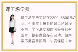 课工场学费可能在2200~8800元之间,但事实上报名的课工场课程不同,学习进度和时间等等都有差异,报名费会存在波动。但同学不用盲目跟风,毕竟课程非常多,可以根据个人能力和兴趣挑选合适的课程,效率会比较优越,也有很好的就业前景。课工场线上指导对同学来说非常有效,首先就是线上辅导的方式可以灵活安排课程的时间,业余时间更加充实,也有利于迅速提高计算机专业成绩。另外,线上辅导方法更有利于拉近师生之间的距离,同学与老师交流和学习的机会更多。课工场有什么热门专业,课工场培训机构的课程特别多,比如人工智能,前端和后端开发,界面设计,云计算,人工智能,互联网架构,计算机编程语言,对大多数计算机专业的人员来说,都有很好的表现机会。