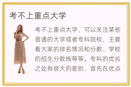 考不上重点大学,可以关注某些普通的大学或者专科院校,主要看大家的排名情况和分数、学校的招生分数线等等。专科的优劣之处有很大的差别,首先在优点方面,专科院校可以为同学制定指导课程,提高个人的技术能力和文化水平,找工作时达到应聘标准。在劣势方面,专科文凭并不如本科文凭,竞争时可能会面临被动的地位。怎么找专科学校,有些专科院校的实力很强,综合水平高,课程十分完善,这些学校值得大家考虑。但如果专科院校的综合水平比较差,教学能力不够强,容易影响进展,不太利于大家的进步。另外大家在挑选专业学校之前,也要看清楚各种专业的排名,有些专业非常好,专业设备十分丰富,同学经过多年学习后,收获也很大,可以进一步缩小与其他同学的差距。