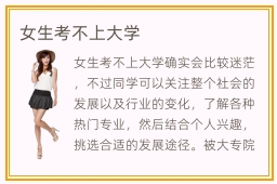 女生考不上大学确实会比较迷茫,不过同学可以关注整个社会的发展以及行业的变化,了解各种热门专业,然后结合个人兴趣,挑选合适的发展途径。被大专院校录取难不难,大专院校的录取分数线比较低,很多同学知道200~400的总分,也可以成功录取。高等专科学校的就业难度并不高,因为很多高等专科院校的就业率可达到99%以上,毕业生并不担心找工作问题。选择学校的时候,不能够只看到就业率,而是要看清楚技术学校综合能力以及自己感兴趣的专业,如果自己都不感兴趣,很难坚持学习下去。另外在找工作过程中,一般要求比较强的工作实力。有些同学的学历普通,技术能力也不过关,找工作当然会成为难题。专科院校的学生即便学历不算高,但也要在学习中争取更好的成绩。