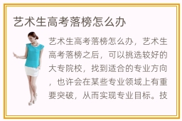 艺术生高考落榜怎么办,艺术生高考落榜高考落榜之后,可以挑选较好的大专院校,找到适合的专业方向,也许会在某些专业领域上有重要突破,从而实现专业目标。技师学院受不受欢迎,技师学院当然是很受欢迎的,首先就是这些学校的指导效果很不错,很多同学在老师的帮助后,赢得相当好的优势,工作上有优质表现,竞争实力更强。大专院校分数线高吗,大专院校的分数线并不算低,但也不是很高,如果没有办法考上本科,可看看各个大专院校的招生情况和招生对象。另外,大专学历并不算很高,许多本科生和研究生在工作上都要面临很残酷的竞争,更何况是大专院校的学生。因此同学得到大专学历之后,有条件的话,可以考虑专升本,得到本科的学历,优化个人的学历和技术背景。