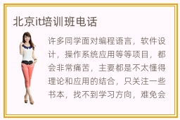 许多同学面对编程语言,软件设计,操作系统应用等等项目,都会非常痛苦,主要都是不太懂得理论和应用的结合,只关注一些书本,找不到学习方向,难免会出现很多负担。当然学生可以通过多种方式,找到合适的学习方向,从而凸显更多进步。北京it培训班电话,it训练班有作用吗,因为很多同学只看书,不懂得怎么应用,成绩相当不好,工作时遇到许多障碍。而辅导班会挖掘同学的问题,推荐大量实践项目,结合优质的设备进行现场展示。学生能接触更多应用知识,也让视野更开阔,不会有太多学习方面的难题。it1对1授课确实非常关键,如果大家不懂学习方法,学习过程中是喜欢开小差,成绩可能就会有影响。但得到老师的1对1指导后,情况会有所改变。