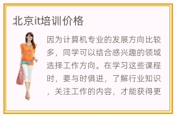 因为计算机专业的发展方向比较多,同学可以结合感兴趣的领域选择工作方向。在学习这些课程时,要与时俱进,了解行业知识,关注工作的内容,才能获得更多提高。有些同学对这些知识的理解不多,面对高难度的课程,会发现要求太多,没办法加快学习进度。北京it培训价格比较适中,可能在3500元到16000元之间。it学校在线课程的优点,有很多好处,比如同学能迅速了解到理论和应用的技能,接触到很广泛的应用技术,把大量的知识掌握。有的同学发现自己问题特别多,而且长时间得不到解决,会产生很多负担,如果报名辅导班,不仅可解决这些问题,也能获得不错的进步。it1对1培训特别重要,因为很多同学的效率低,长时间没有进展,就不得不报名这些1对1的课程,大大提高学习的优势。