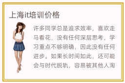 许多同学总是追求效率,喜欢走马看花,没有任何深层思考,学习重点不够明确,因此没有任何进步。如果长时间如此,还可能会与时代脱轨,容易被其他人淘汰,所以大家还是要有深层的思考。上海it培训价格一般是4500元到21000元,课程类型不同,而且报名的学校以及教学方式等等都不一样,收费往往也会有差别。it补习班优点什么,主要优点就是帮同学们打开思路,安排多种理论课程和应用课程,使同学的基础更扎实。有些课程难度较高,学习方向也很模糊,但不用担心,老师会一对一辅导,帮同学解决难题,使同学拥有更多的提高。对于一些基础不好的同学,老师就会讲解一些入门级的课程。it找工作简不简单,该行业的人在缺口非常大,找工作会很轻松,大家可以找到满意的岗位。