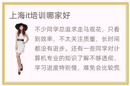 不少同学总追求走马观花,只看到效率,不太关注质量,长时间都没有进步。还有一些同学对计算机专业的知识了解不够透彻,学习进度特别慢,难免会比较慌张,希望有老师指定课程,获得更多的提高。上海it培训哪家好,其实不同的学校有不一样的教学要求和培训项目,所以同学可以根据自身的情况和学习需求来考虑。it指导学校收费高吗,其实辅导班的收费主要看学校的教学方式,培训内容,口碑等。有些同学技术都差,想要学习一些入门级的软件理论和计算机专业理论,这时学习的难度比较低,培训周期较短,报名费也会下降。当然也有一些同学对自身的要求比较高,it前景如何,计算机前景确实很好,有非常多的机会,大家可以把握住,从而赢得更好的发展,争取更多的进步。
