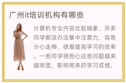 计算机专业内容比较抽象,许多同学都没办法集中注意力,容易分心走神,很难提高学习的效率。一些同学很担心这些问题越来越明显,影响将来的学习成绩。为了得到更多提高,同学们可以选一些口碑较好、教学水平较高的专业机构,把重点课程掌握。广州it培训机构有哪些,一般都会从几个角度判断,包括师资力量,综合排名,课程类型等等。it训练机构1对1课程有相当明显的优势,比如老师可挖掘同学在就业和专业领域的不足,确定好学习的规划,一步步帮助同学解答。其次,老师会结合工作重点,安排多种训练项目,同学不仅能学习到很多关于理论的内容,也会掌握很多工作当中的要求。it课程难不难,大家在学习期间,不要只满足于一些简单的课程,要根据自身能力,适当提高学习难度,从而实现更多突破。