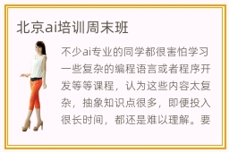 不少ai专业的同学都很害怕学习一些复杂的编程语言或者程序开发等等课程,认为这些内容太复杂,抽象知识点很多,即便投入很长时间,都还是难以理解。要是平时只是自学,没有老师引导,容易陷入迷茫状态。要是同学向辅导机构的老师请教,老师会把这些知识介绍给大家。北京ai培训周末班很重要,既能节约时间,又能提高学习效率。ai辅导学校费用怎么样,具体收费并不是固定不变,因为专业辅导机构很多,大家可以适当对比,了解不同的费用影响因素,包括课程类型,师资力量,学校的口碑等。如果选择一些小型的培训机构,虽然费用比较低,但是学习效果可能不算太好,所以大家要预防此类情况。ai辅导学校有什么样的优点,帮助同学打开视野,改善专业能力。