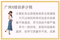 计算机专业领域有很多应用课程,只不过有的同学对这些内容掌握不够透彻,学习目标不够严谨,学习一段时间,发现内容越来越多,但学习质量并不高,成果并无法得到保障。若想获得进步,可以报名辅导班,把很多重要的知识掌握。广州it培训多少钱,一般是4000~16000元,但要看很多因素。it教育机构有用吗,许多辅导机构的教学效果都很不错,老师的课程很严谨,学习的质量很高,同学的学习速度也会很快。对于很多同学而言,没有良好的学习思路,学习进度特别慢,成绩不理想,都会影响自己的状态。好在可以选择报班,让大家方向更明确,进度加快,状态也会更好。it主要课程非常丰富,包括数据分析,软件开发设计,云计算,程序设计应用等,对同学帮助都相当大。