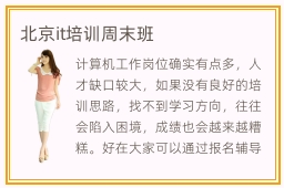 计算机工作岗位确实有点多,人才缺口较大,如果没有良好的培训思路,找不到学习方向,往往会陷入困境,成绩也会越来越糟糕。好在大家可以通过报名辅导班的方式弥补专业的知识,完成多种工作任务,从而达到更高水平。北京it培训周末班很重要,同学们在家上课,不用到现场听课,确实非常方便。it补习机构实践课程非常实用,因为这些实践内容跟工作都非常有关系,老师会分析同学的专业水平和工作能力,结合工作方向,安排不同阶段的实践课程。同学很快就能找到学习节奏,明确自己的学习项目和薄弱环节,一步步进行弥补,相信工作能力会在短期内提高。it手把手教学很重要,会让基础更牢固,而且专业水平更高。不过同学有问题,还是要主动请教,不要总是拖延。