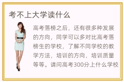 高考落榜之后,还有很多种发展的方向,同学可以多对比高考落榜生的学校,了解不同学校的教学方法,培训的方向,培训质量等等。请问高考300分上什么学校好,可以上排名靠前的,专业技术先进的学校类型。计算机学院的专业类型比较丰富,比如大家比较热衷计算机软件开发、计算机编程设计、python编程等等。高考落榜后有哪些出路学校花钱多不多,高考落榜之后,可以选择专业水平高的大专院校,那费用可能也不是特别贵,一般也会有收获。然后就是要观察了解现在社会的发展形势,选择一门适合自己的、具有发展前景的专业进行学习,这对于高考落榜的同学来说是很重要的。大专院校分数线高吗,大专院校的分数线并不算低,但也不是很高,如果没有办法考上本科,可看看各个大专院校的招生情况和招生对象。