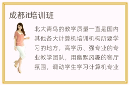 北大青鸟的教学质量一直是国内其他各大计算机培训机构所要学习的地方,高学历、强专业的专业教学团队,用幽默风趣的客厅氛围,调动学生学习计算机专业的热情,打破了传统计算机专业教学的枯燥性,在潜移默化中让学生得到更专业更高效的学习效果。成都it培训哪个好,若基础不是很好,可以关注一些入门的it课程,这些课程的入门难度不高,学习时间短,符合新手训练。it培训网络课程非常有用,同学可以从中积累很多重点课程,也可以随时上课,不需要受到空间和时间限制。计算机相关专业的学习是一个漫长而又枯燥的过程,要想学好计算机相关专业,找到一所靠谱的计算机专业培训学校是很重要的。挑到成都,人人必然会不禁自立的想起成都的冰雕艺术,成都的冰雕遭到了良多人的爱好。