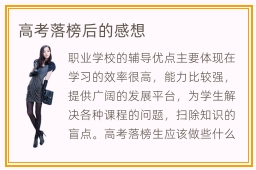 职业学校的辅导优点主要体现在学习的效率很高,能力比较强,提供广阔的发展平台,为学生解决各种课程的问题,扫除知识的盲点。高考落榜生应该做些什么呢。只要少部门高考落榜生的选择是进入一所靠谱的专业技术培训学校学习专业技术,这部门高考落榜生的选择才是比较理智的,只要把握好了一门存在广漠成长前景的专业技术能力在将来就业进程中更顺遂。专职类院校有哪些,专职类院校有很多,比如技术职业学校以及技工学院,专科师范类学校。我高考落榜了高考落榜了怎么办可以读大学吗,高考落榜后是可以读大学的,大家在选择学校的时候,还是要多关注每个学校的专业排名,学生的水平,整体的教学氛围。不过不必担心,因为如今的职业学校特别多,同学不仅可以报名一些专科学校,还可以选择技术学院等等。