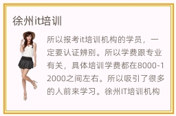所以报考it培训机构的学员,一定要认证辨别。所以学费跟专业有关,具体培训学费都在8000-12000之间左右。所以吸引了很多的人前来学习。徐州IT培训机构怎么样。虽然徐州IT培训学校收费会比培训班稍高一点,但是还是建议新手报名培训学校,因为他们的教学过程更科学,更有保障一些,学生可以确保能真正学到有用的东西,毕业后方便就业。要是同学没有办法积累这些知识,还可以向老师请教,相信收获会更为明显。徐州it培训机构往往会认真指导,为同学布置个性化鲜明的课程,也会有详细的指导方案。面对这些问题的时候,也见怪莫怪,因为多数同学都遇到过这样的问题,只要调整好学习思路,找到合适的训练方向,一步步练习,相信将来会更好。