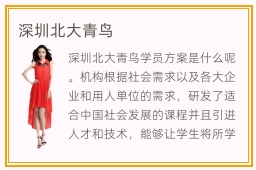 深圳北大青鸟学员方案是什么呢。机构根据社会需求以及各大企业和用人单位的需求,研发了适合中国社会发展的课程并且引进人才和技术,能够让学生将所学的知识和技能实际运用在职业生涯中,经过这么些年的发展,深圳北大青鸟学校也确实越办越好。你是否想知道深圳北大青鸟学费吗。北大青鸟电脑培训电脑培训学校是一所以计算机专业为主的培训机构,为国内it行业送去了大批优秀的it人才。北大青鸟深圳校区是北大青鸟众多校区中的一个,专注于深圳地区的学员们提供专业正规的IT职业培训,是深圳地区的学员们进行IT职业培训的正确选择。北大青鸟深圳校区,教学方式比较独特。害怕被拒绝。深圳北大青鸟学费就是如此的优秀的一所专业学校。深圳北大青鸟学费是深圳市内一所办学比较早,办学体系比较成熟的北大青鸟培训机构,已经不断地成为了业内北大青鸟培训机构的先行者。
