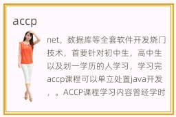 net,数据库等全套软件开发烧门技术,首要针对初中生,高中生以及划一学历的人学习,学习完accp课程可以单立处置java开发,。ACCP课程学习内容曾经学时ACCP课程始于2002年,至今曾经更新7个版本,最新课程版本为ACCP7。Accp是计算机培训学校软件工程师课程,课程内容首要学习软件开发方向的技术,焦点技术点是java,。0课程,ACCP软件课程由威望学术界人士、知名软件企业技术专家、以及IT财产的精采专家代表构成专家参谋团,并由150多名知名技术开发职员,在对中国IT企业,培训中心颠末一系列调研的基础上,研发实现。为了便利人人领会,上面全面细致介绍一下Accp课程。上面就人人揭开accp的奥秘面纱。