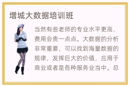 当然有些老师的专业水平更高,费用会贵一点点。大数据的分析非常重要,可以找到海量数据的规律,发挥巨大的价值,应用于商业或者是各种服务业当中。总体来说,增城大数据培训的资历都是相当不错的,有些学校拥有良好的设备,环境资源也非常不错,可以让学生拥有更好的学习空间和氛围。增城大数据培训班教学环境如果是比较好的情况下,那么学生的学习氛围往往会更加舒适,学生在这些环境下的学习效率会更高。人人可以遴选靠谱的培训班,闭注一下增城大数据培训机构排名最新,领会每个培训班的讲授水平、培训才能、培训的体例。而决定前途的就是自己如何去做。数据分析工程师的薪资相当高,一些技术人员每一个月都能拿到1万到3万的待遇,若能力很强,待遇会上升。