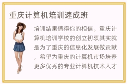 培训结果值得你的相信。重庆计算机培训学校的创立初衷其实就是为了重庆的信息化发展做贡献,希望为重庆的计算机市场培养更多优秀的专业计算机技术人才,从而加速重庆经济水平的进步。重庆计算机培训现实结果也很明显。计算机行业是比较吃香的一门行业。那么,你知道在这些重庆计算机学校中有哪些是比较靠谱的吗。重庆计算机学校,计算机学校要求如何,许多计算机学校的要求都很严格,比如要拥有不错的专业基础和应用实力,提高技术竞争能力和职业水平。学什么手艺好,其实每个学生的兴趣和每个时代的专业发展状况不同,同学要详细分析,不能随便做决定。进入计算机培训学校学习真的可以速成嘛。需要综合重庆计算机培训学校的教学情况和办学色彩等各项指标。