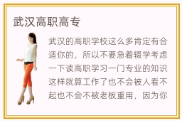 武汉的高职学校这么多肯定有合适你的,所以不要急着辍学考虑一下读高职学习一门专业的知识这样就算工作了也不会被人看不起也不会不被老板重用,因为你有技术都会看重你的,社会方面也会很受欢迎。武汉高职院校有自己的收费标准,不同的专业自然需要不同的费用。那末,贵武汉职院校是否是靠谱的学校呢。当然还要看个人的学习能力,有些人的学习态度比较糟糕,也不注意花时间到学习当中,经常拖延作业,那么很难达到自己想要的教学成果。武汉高职院之所以能够在武汉市的专业技术教育行业地位很高,这与它优秀的的教学效果是息息相关的。资武汉职院校压力大不大,大多数的压力都是比较少的,但要想找一份好的工作,还是需要自身的努力。大家对于武汉高职院校还得很认可的,认为武汉高职院校的教学团队很权威,因此武汉高职院校的专业教学培训是可以得到广大市民信任的。