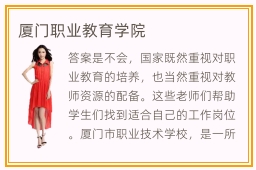 答案是不会,国家既然重视对职业教育的培养,也当然重视对教师资源的配备。这些老师们帮助学生们找到适合自己的工作岗位。厦门市职业技术学校,是一所公办高职院校,学校成立于1979年,有着悠久的历史文化。如果总是依赖培训班,自己没有投入精力和时间,甚至连基本的技术应用都不了解,找工作当然会遇到许多障碍。那么这些厦门职业学院教学模式是怎么样的呢。但大家不要只考虑费用的问题,因为有些学校还可能存在隐形的费用。厦门职业学院好不好,一般来说可以关注一下学校的教师情况,有些学校有非常优秀的教师,拥有更多成熟的经历,让学生可以了解现在的专业发展方向,可以把握未来的趋势。厦门职业学院毕业证含金量大多数都不错,不过也有学校的排名比较落后,学生又没有明显的成绩,那么毕业之后可能也会面临失业的风险。