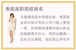 与普通高级中学相比较,贵阳职业高中和中专在入学门槛上更低一些,在校期间课程内容以职业技能教育为中心,同时也兼具一定的文化课程,目的是让学生毕业后继续在对口专业升学继续深造。那么,你觉得贵阳高职学校的教学质量怎么样呢。公立职业学院在教学质量上都是有一定保障的,可以说各有特长,学校之间区别一般在于所擅长的专业不同。高职院校实在太多了,要想找比较好的学校,要从多个角度来判断,包括老师的水平,每个学生的实习情况。但也不排除有些高职院校并不是重视实践的能力,而且还会教授比较过时的知识,尤其是在计算机行业或者是科技行业,往往会比较吃亏。他们认为选择一次所好的学校学习是至关重要的。笔者这里推荐贵阳职业技术学院,该校是一所公立大学。