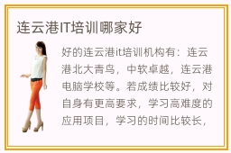 好的连云港it培训机构有:连云港北大青鸟,中软卓越,连云港电脑学校等。若成绩比较好,对自身有更高要求,学习高难度的应用项目,学习的时间比较长,难度较高,费用也会提高。这些专业技术也都是有实际用途的。不少学校都提供it小班辅导,一个班级只有5个人到10个人,同学可以得到老师的细心照顾,只要有任何问题,老师可以马上反馈,为大家进行解答。在当下信息化和经济高速发展的今天,社会就业压力不断增长,各行业中,唯有将理论很好的运用于实践才能得到好的出路。IT培训会不会很简单,如果是没有太多学习的经验,或者是选择高端的课程,需要更长时间去适应,所以IT培训的难度也会存在。但是在学习期间,不能只依赖专业机构,应该有自己的思考,整理成自己的框架。