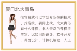 很容易就可以学到专业性的技术。找路线,要网上找。北大青鸟有什么课程,北大青鸟的课程很丰富,比如网络设计,软件开发,界面设计,计算机编程,人工智能,云计算。首先,北大青鸟重点培养的技术和理论知识均是当下社会热门行业,在社会上具备很大的需厦门北大青鸟学校职业素质养成求。那么厦门北大青鸟学校怎么样呢。想要知道厦门北大青鸟地址是什么的话。厦门北大青鸟怎么样,培养的学生非常的多。没关系,这里为你回答了所有你想问的问题,课程安排、各种课程的学费问题以及未来的就业问题等等,我们希望能够为您提供您想要的东西。北大青鸟学校不包含在中国的义务教育之中,所以是需要自费的,由此,学费必是每个前来求学的学生及家长最为关心的事情之一。