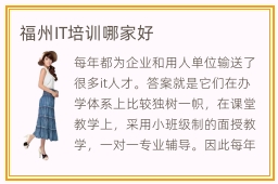 每年都为企业和用人单位输送了很多it人才。答案就是它们在办学体系上比较独树一帜,在课堂教学上,采用小班级制的面授教学,一对一专业辅导。因此每年7-8月报考计算机学校的人也非常多。如果学生想快点找到合适的学习方案,提高个人IT应用能力,可报名福州it培训。大家也不用担忧,因为可以报名福州it培训机构,老师会结合企业需求以及行业发展动态,安排多种课程,这样同学就能够一步步深入了解行业发展现状,然后也能紧跟行业的方向,一步步实现更多目标。福州IT培训学校简介,一般是要看学生的水平,老师的教学质量以及学校的教学模式等等,如果学校的教学模式还是比较不错的,比如劳逸结合,大小班结合,都有不错的效果,而且教学优势会变得更加明显。