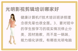 健康计算机IT技术培训班讲授理念很先辈也很全面。3、要对班中的学生按学习的现实情况停止分类,因材施教,而不是一锅端,能力细化讲授。有哪些光明电脑培训学校性价比高。光明地区也开始提高了计算机专业人才的培训意识,不仅在光明市的各大高校、大学开设了计算机相关专业的课程,例如java语言编程设计、ui软件界面设计以及php数据库维护升级等等。光明电脑学校通过开展一系列以提升计算机专业技术为主的活动,积极鼓励光明电脑学校的在校学员参加,当然还有很多其他学校的学员也回来参与其中。亲身到学校实地考查。比来良多同窗都在问光明计算机培训学校校区地址,光明计算机培训学校电话之类的成绩,上面就告知人人这些成绩的应案。