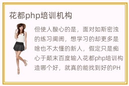 但使人酸心的是,面对如斯密浊的练习阛阓,想学习的却更多是啥也不太懂的新人,假定只是痴心于颠末百度输入花都php培训构造哪个好,就真的能找到好的PHP练习构造,这几近便是胡想。当然学习php技术并不是特别的容易,得到专业的培训班学习才可以学到非常专业的知识。不过,这也是学成以后的事情,目前我们只有选择学校,好好学习php知识,掌握编程技术,努力成为这个领域的人才。也会受企业重用。php培训机构达内算得上是互联网教育培训学校排名榜单上首屈一指的了,达内建立多年以来,一向倾力打造高本质强专业的php设计工程师,各大企业与达内关作之后都对达内培育出来的学生拍案叫绝,达内涵各方面都足以让人相信。如果学生只是自学一门课程,那可能遇到的其他综合性的课程内容时就很难熟练掌握。