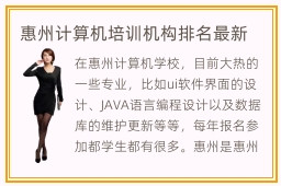 在惠州计算机学校,目前大热的一些专业,比如ui软件界面的设计、JAVA语言编程设计以及数据库的维护更新等等,每年报名参加都学生都有很多。惠州是惠州省非论从交通方面,还是经济成长方面都是很主要的一个处所,是人流量比较稠集的地区,可以绝不夸大的说惠州的成长离不了惠州,与惠州的经济扶植息息相干。在惠州计算机学校的选择方面也要多加注重,分歧的培训机构、分歧的讲授团队会带来分歧的学习结果。惠州计算机IT培训学校办学特点有哪些吸收人的处所。惠州计算机培训机构创办眼的明白,便是给社会保送新的计算机人材。在惠州计算机培训学校可以轻松的掌握计算机技术。惠州位于惠州省,也是惠州省的省城,一个经济发财的主要都会。惠州计算机学校功课安排有哪些。