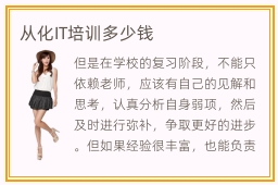 但是在学校的复习阶段,不能只依赖老师,应该有自己的见解和思考,认真分析自身弱项,然后及时进行弥补,争取更好的进步。但如果经验很丰富,也能负责很多复杂的技术任务,那么薪资待遇便可以更高。当然对于刚起步的IT专业学员是比较困难的事情,这个时候不妨考虑专业的IT机构,在辅导教师指导下也许会有更加长远的进步,也能收获更多有用的经验和学习的技巧。IT专业培训机构的教学特色鲜明,适用于不同基础的专业技术人员,更加注重应用能力的提升,除了能弥补各种基础课程,还可以结合前沿的技术,帮助学生了解it专业的发展趋势和动态。所以大家在选择时一定要擦亮双眼。从化it培训学校都是一些建立时间比较久的学校。想要改善这些情况,可选择许多教育机构,老师的安排比较严谨,教学思路明确,同学收获也很大。