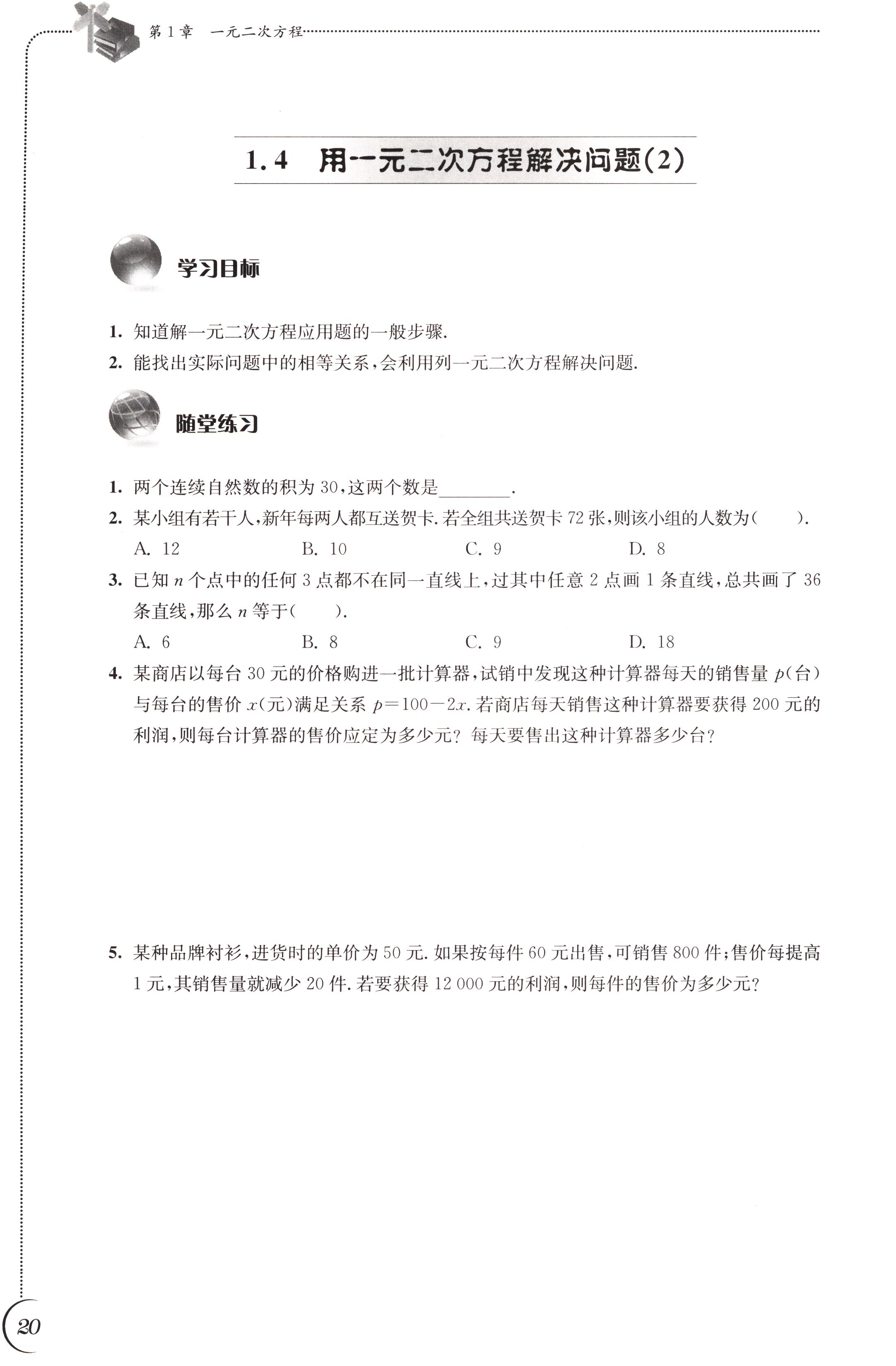 1.4 用一元二次方程解决问题(2)第20页全部答案解析