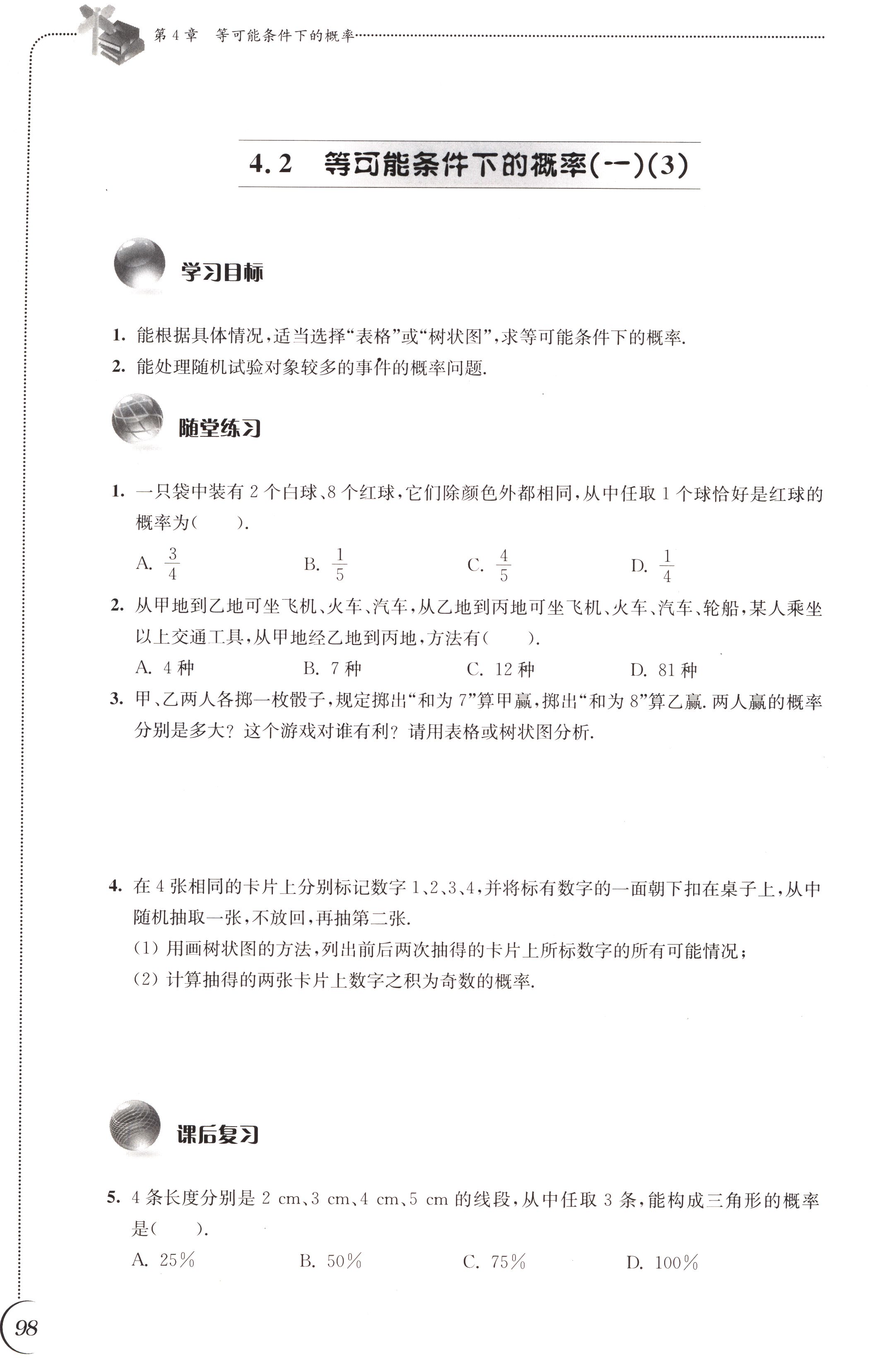 4.2 等可能条件下的概率(一)(3)第98页全部答案解析