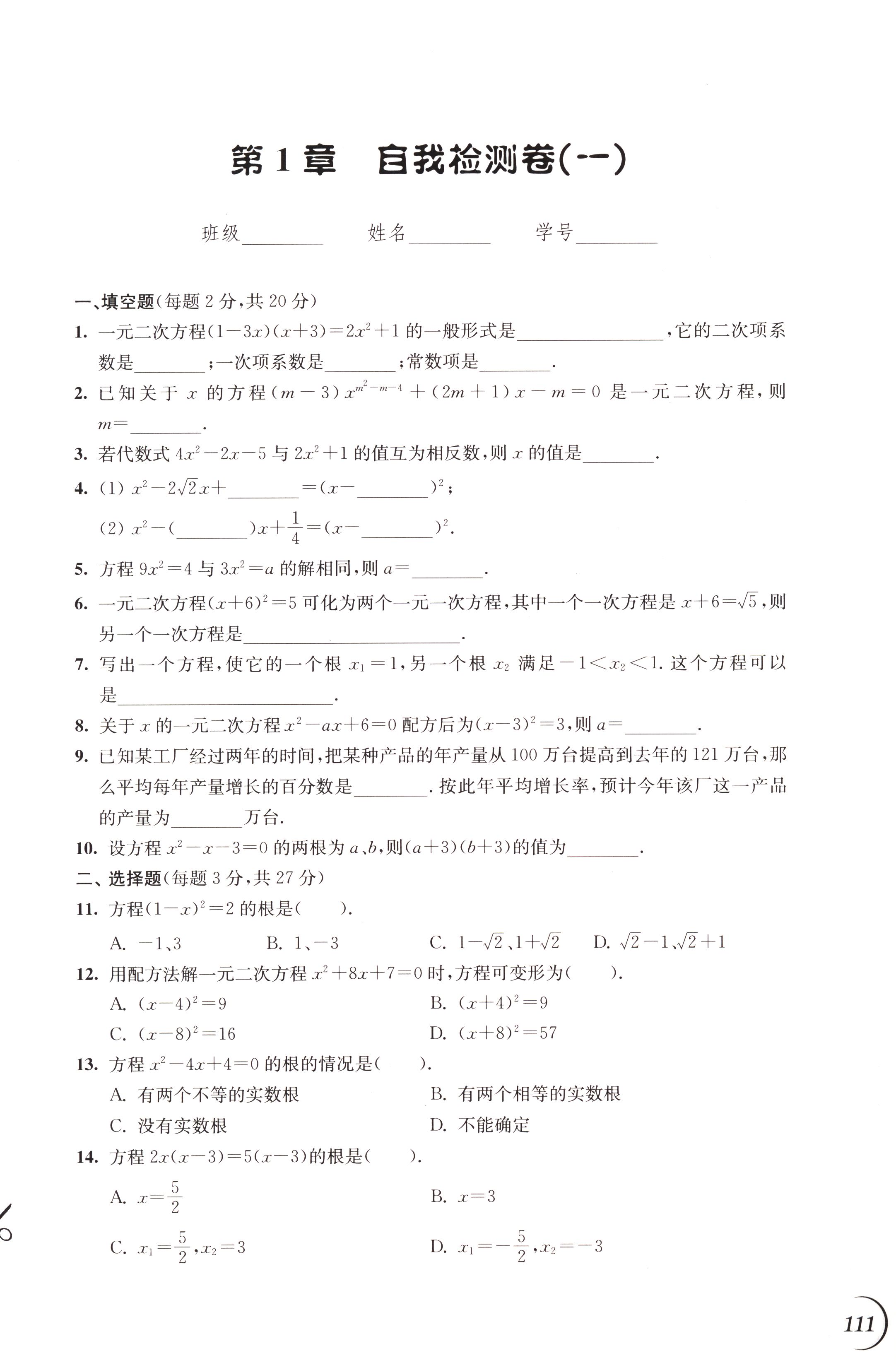 第1章 自我检测卷(一)第111页全部答案解析