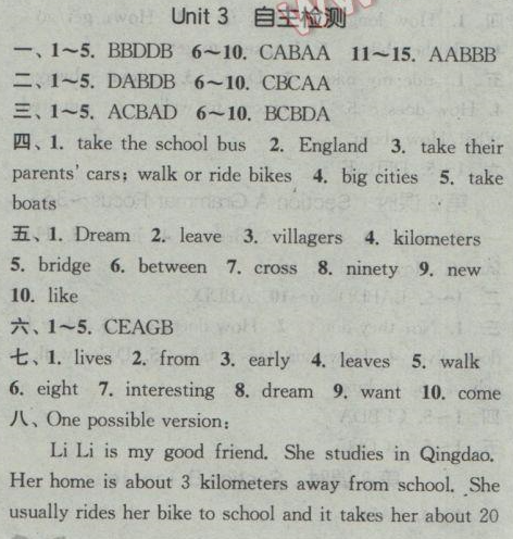 人教版七年级下册英语课时作业本Unit 3单元自测卷答案