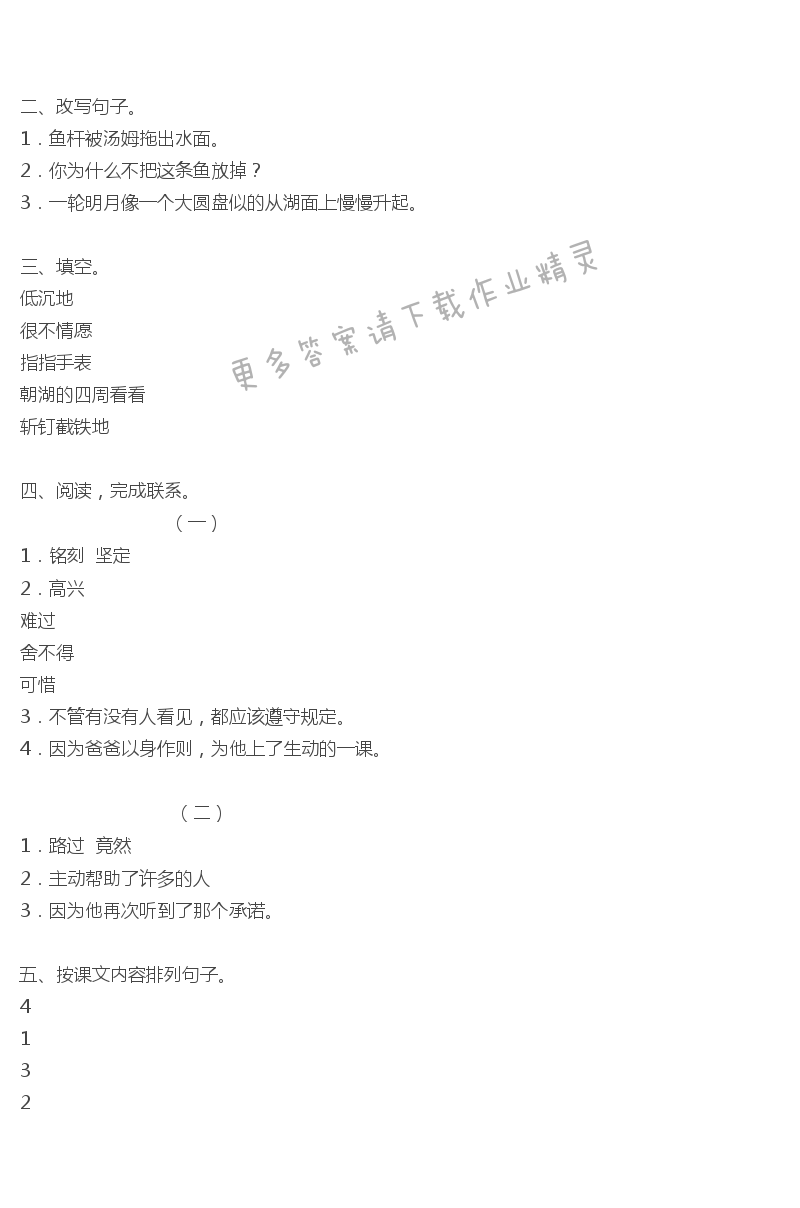 二、改写句子。 1.鱼杆被汤姆拖出水面。 2.你为什么不把这条鱼放掉? 3.一轮明月像一个大圆盘似的从湖面上慢慢升起。 三、填空。 低沉地 很不情愿 指指手表 朝湖的四周看看 斩钉截铁地 四、阅读,完成联系。 (一) 1.铭刻坚定 2.高兴 难过 舍不得 可惜 3.不管有没有人看见,都应该遵守规定。 4.因为爸爸以身作则,为他上了生动的一课