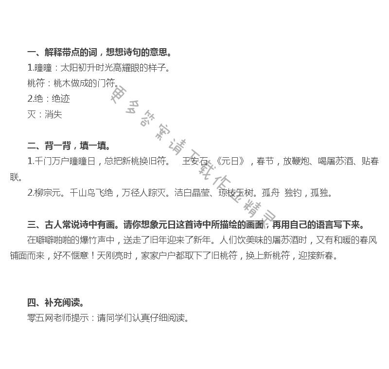 一、解释带点的词,想想诗句的意思。1.曈曈:太阳初升时光高耀眼的样子。桃符:桃木做成的门符。2.绝:绝迹灭:消失二、背一背,填一填。1.千门万户曈曈日,总把新桃换旧符。 王安石《元日》,春节,放鞭炮、喝屠苏酒、贴春联。2.柳宗元。千山鸟飞绝,万径人踪灭。洁白晶莹、琼枝玉树。孤舟独钓,孤独。三、古人常说诗中有画。请你想象元日这首诗中所描绘的画面,再用自己的语言写下来。在噼噼啪啪的爆竹声中,送走了旧年迎来