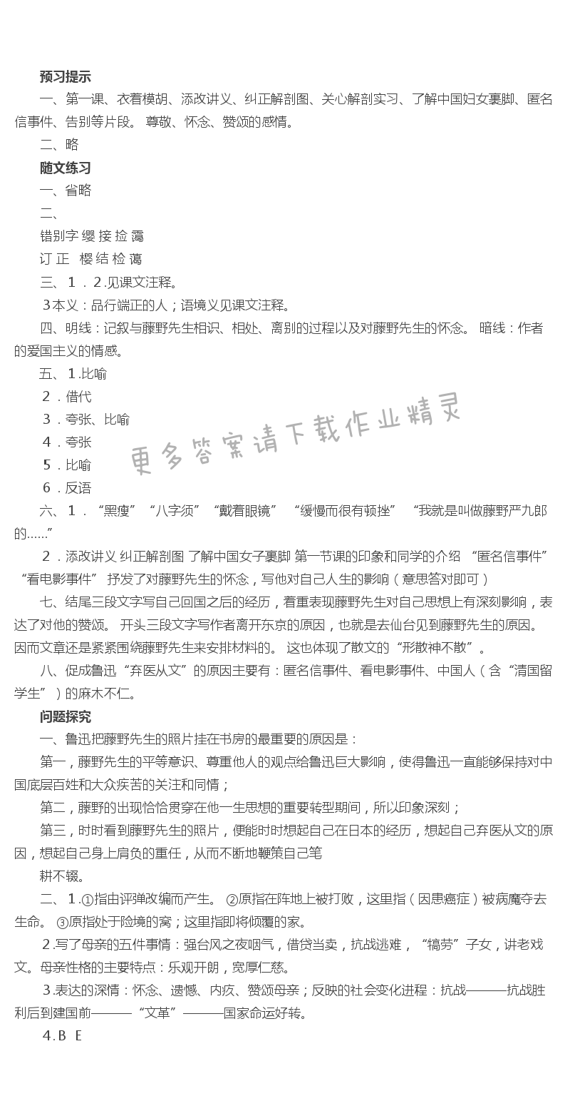 预习提示一、第一课、衣着模胡、添改讲义、纠正解剖图、关心解剖实习、了解中国妇女裹脚、匿名信事件、告别等片段。 尊敬、怀念、赞颂的感情。二、略随文练习一、省略二、错别字 缨 接 捡 霭订 正 樱 结 检 蔼三、1.2.见课文注释。 3本义:品行端正的人;语境义见课文注释。 四、明线:记叙与藤野先生相识、相处、离别的过程以及对藤野先生的怀念。 暗线:作者的爱国主义的情感。 五、1.比喻 2.借代3.夸张、比喻 4.夸张 5.比喻 6.反语 六、1.“黑瘦”“八字须”“戴着眼镜” “缓慢而很有顿挫” “我就是叫做藤野严九郎的……” 2.添改讲义 纠正解剖图 了解中国女子裹脚 第一节课的印象和同学的介绍 “匿名信事件” “看电影事件” 抒发了对藤野先生的怀念,写他对自己人生的影响(意思答对即可) 七、结尾三段文字写自己回国之后的经历,着重表现藤野先生对自己思想上有深刻影响,表达了对他的赞颂。 开头三段文字写作者离开东京的原因,也就是去仙台见到藤野先生的原因。 因而文章还是紧紧围绕藤野先生来安排材料的。 这也体现了散文的“形散神不散”。八、促成鲁迅“弃医从文”的原因主要有:匿名信事件、看电影事件、中国人(含“清国留学生”)的麻木不仁。问题探究一、鲁迅把藤野先生的照片挂在书房的最重要的原因是:第一,藤野先生的平等意识、尊重他人的观点给鲁迅巨大影响,使得鲁迅一直能够保持对中国底层百姓和大众疾苦的关注和同情;第二,藤野的出现恰恰贯穿在他一生思想的重要转型期间,所以印  |