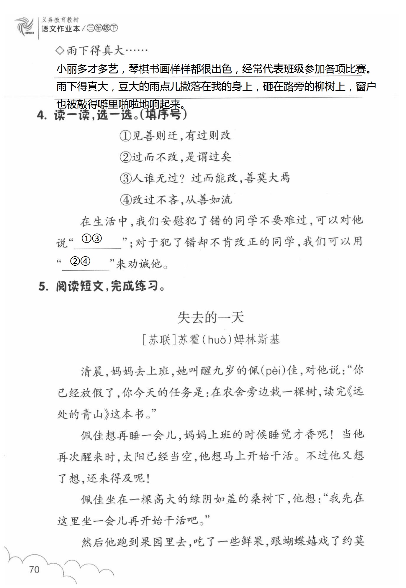 2020年语文作业本三年级下册人教版浙江教育出版社第70页