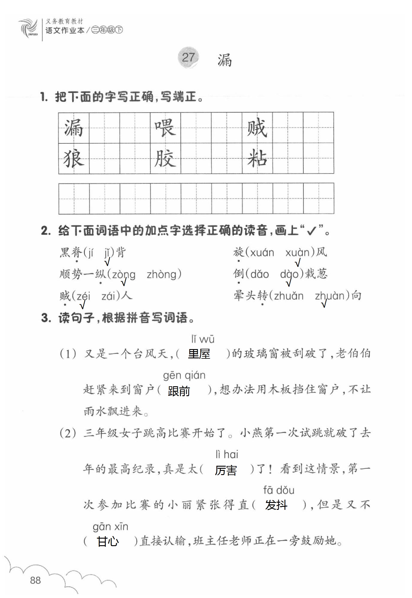2020年语文作业本三年级下册人教版浙江教育出版社第88页