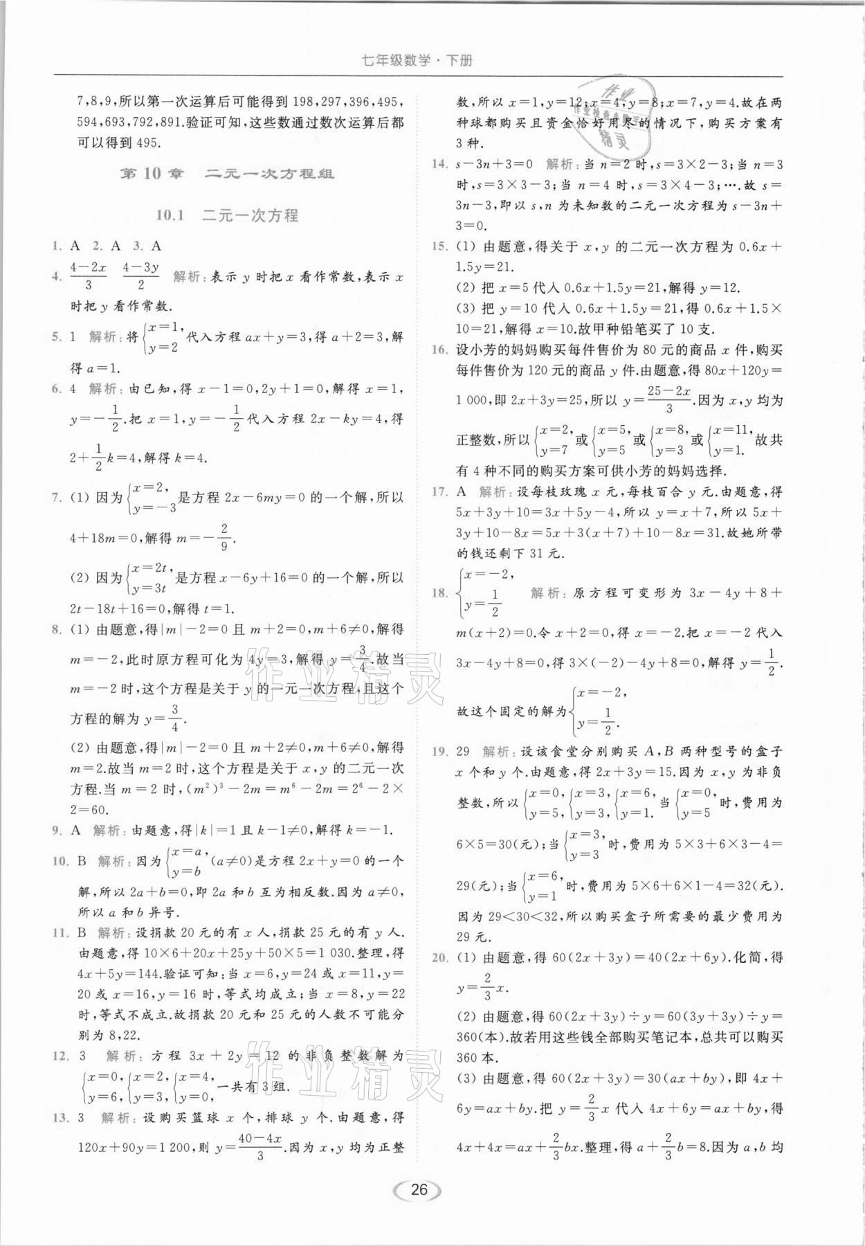 2021年亮点给力提优课时作业本七年级数学下册苏科版参考答案第26页