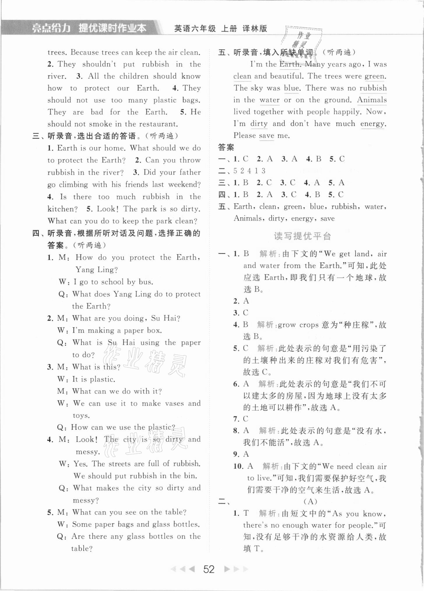 2021年亮点给力提优课时作业本六年级英语上册译林版第52页