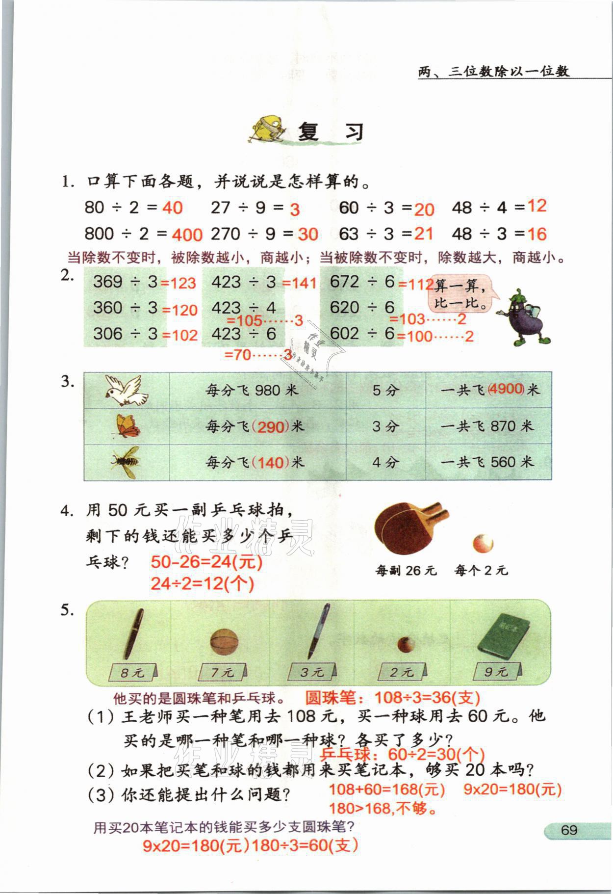 2021年教材课本三年级数学上册苏教版参考答案第69页