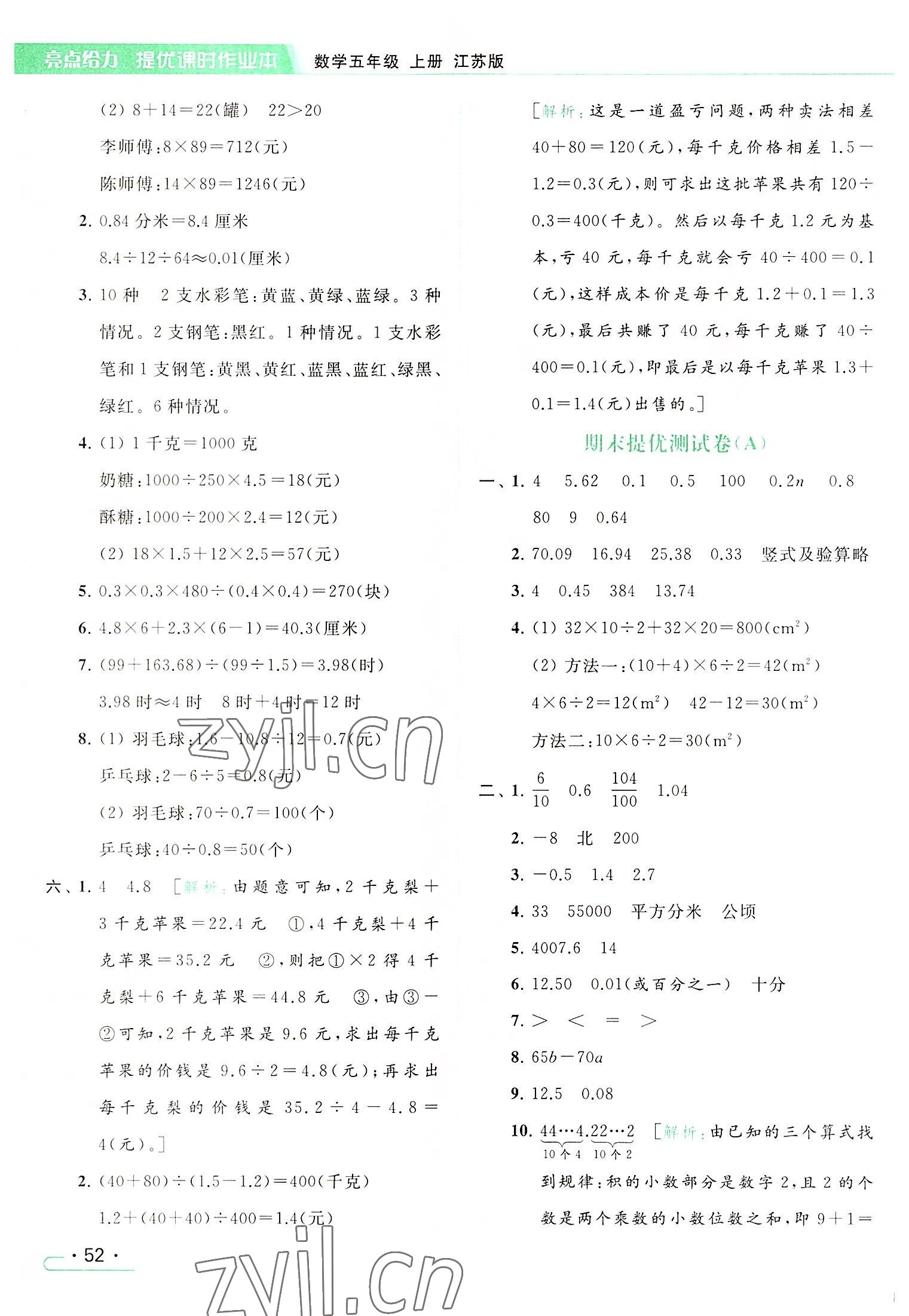2022年亮点给力提优课时作业本五年级数学上册江苏版参考答案第52页