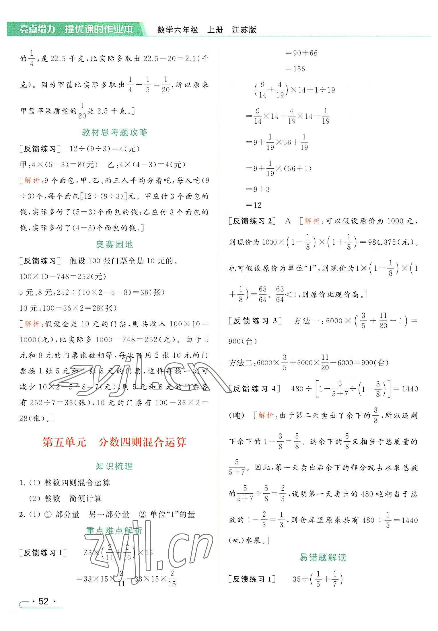 2022年亮点给力提优课时作业本六年级数学上册江苏版参考答案第70页