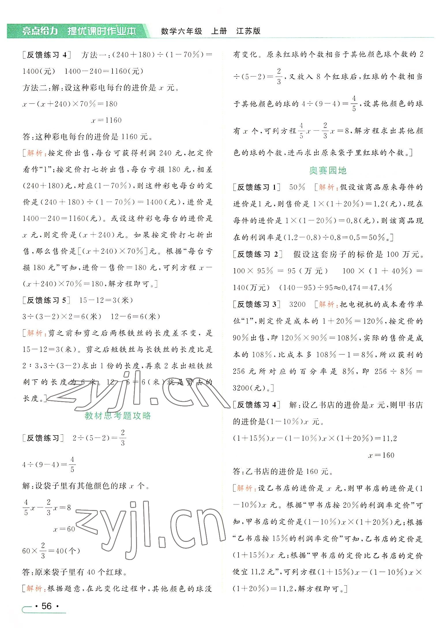 2022年亮点给力提优课时作业本六年级数学上册江苏版参考答案第74页